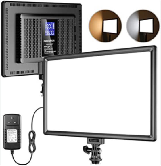 My Kit: 40 watt Neewer LED panel light provides the perfect lighting for indoor filming, with adjustable brightness and colour temperature